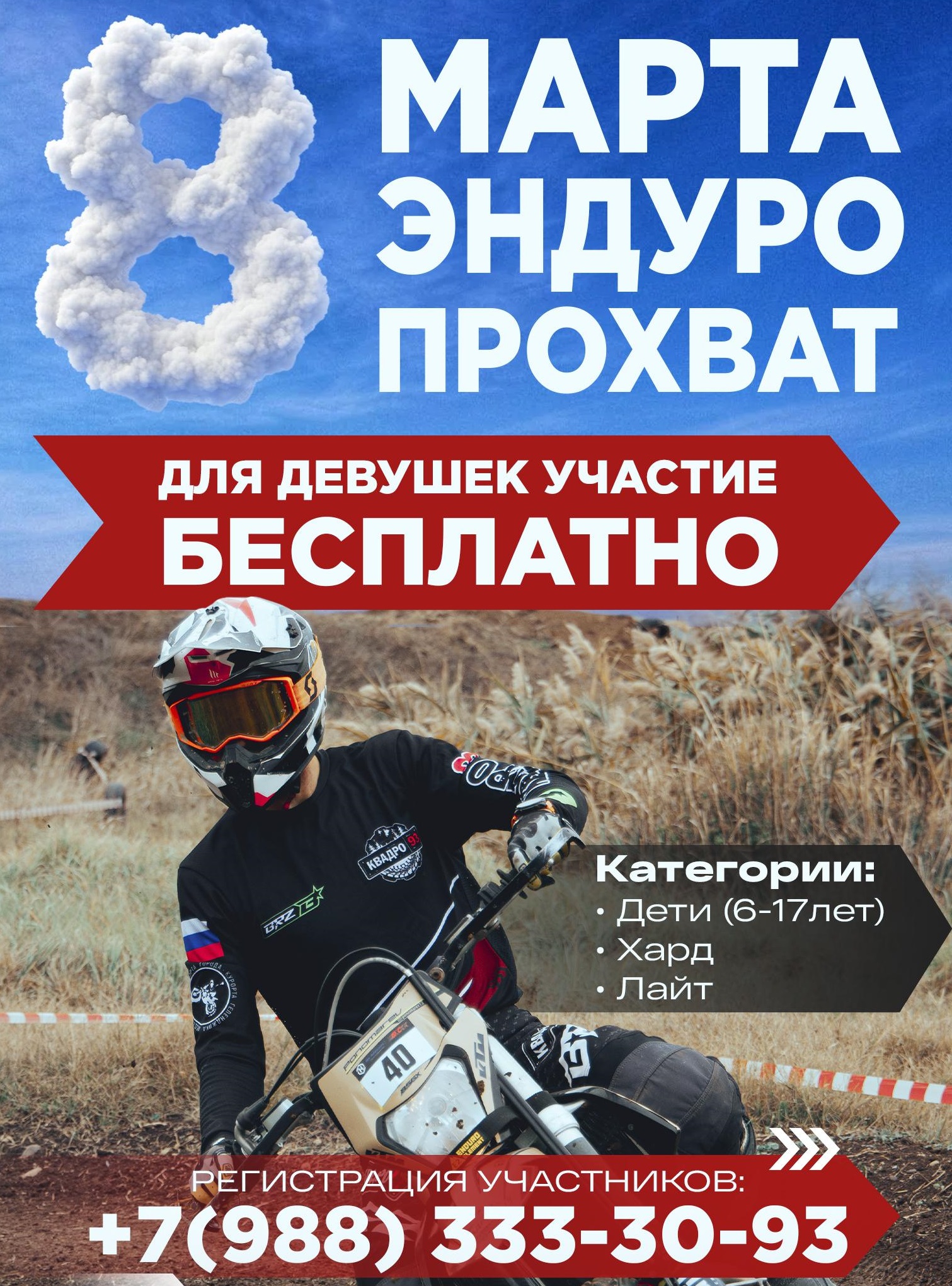 Команда КВАДРО93 объявляет о начале регистрации на традиционный эндуро-прохват, которые мы проводим в начале каждого месяца. На этот раз заезд будет посвящен Международному женскому дню!